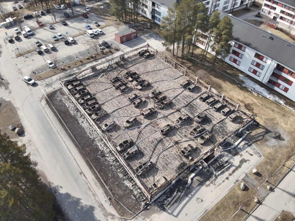 Nära 90 fordon förstördes i den våldsamma garagebranden på Kallkällan i Luleå. BILD: Polisen