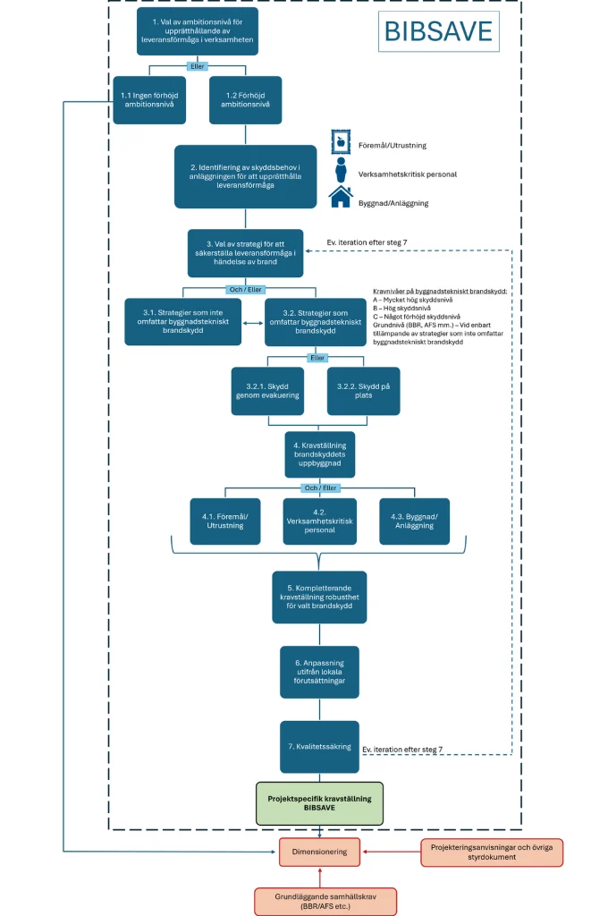 Ramverket BIBSAVE består av sju steg, från ambition till kvalitetssäkring. Det inleds med att man bestämmer ambitionsnivån – det vill säga hur kritisk är den specifika verksamheten och hur prioriterat är det att skydda den? Här ställer man frågor som: Har byggnaden en direkt påverkan på samhällets förmåga att hantera kriser? Hur snabbt behöver funktionerna i byggnaden återställas efter en brand? Finns det alternativa lokaler eller är detta en unik nod i ett större nätverk? Är byggnaden svår att ersätta på grund av kulturhistoriskt värde, läge eller tekniskt innehåll? Behöver byggnaden hållas igång även under en pågående händelse?