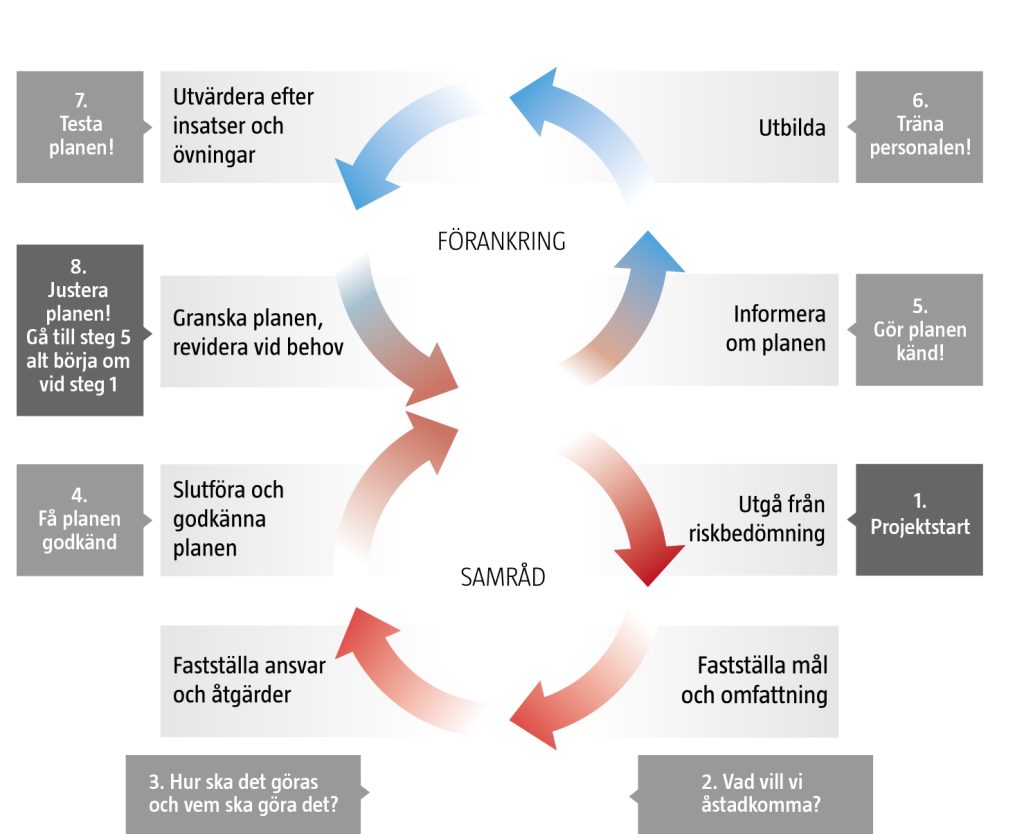 Ett par år senare tog MSB fram en processmodell för insatsplanering, inspirerad bland annat av Storbritannien. Den fick namnet Åttastegsmodellen, och några räddningstjänster fick möjlighet att testa den – bland annat Skellefteå, som behövde en ny plan för stadens oljehamn. Numera används modellen också för underjordsgruvor.