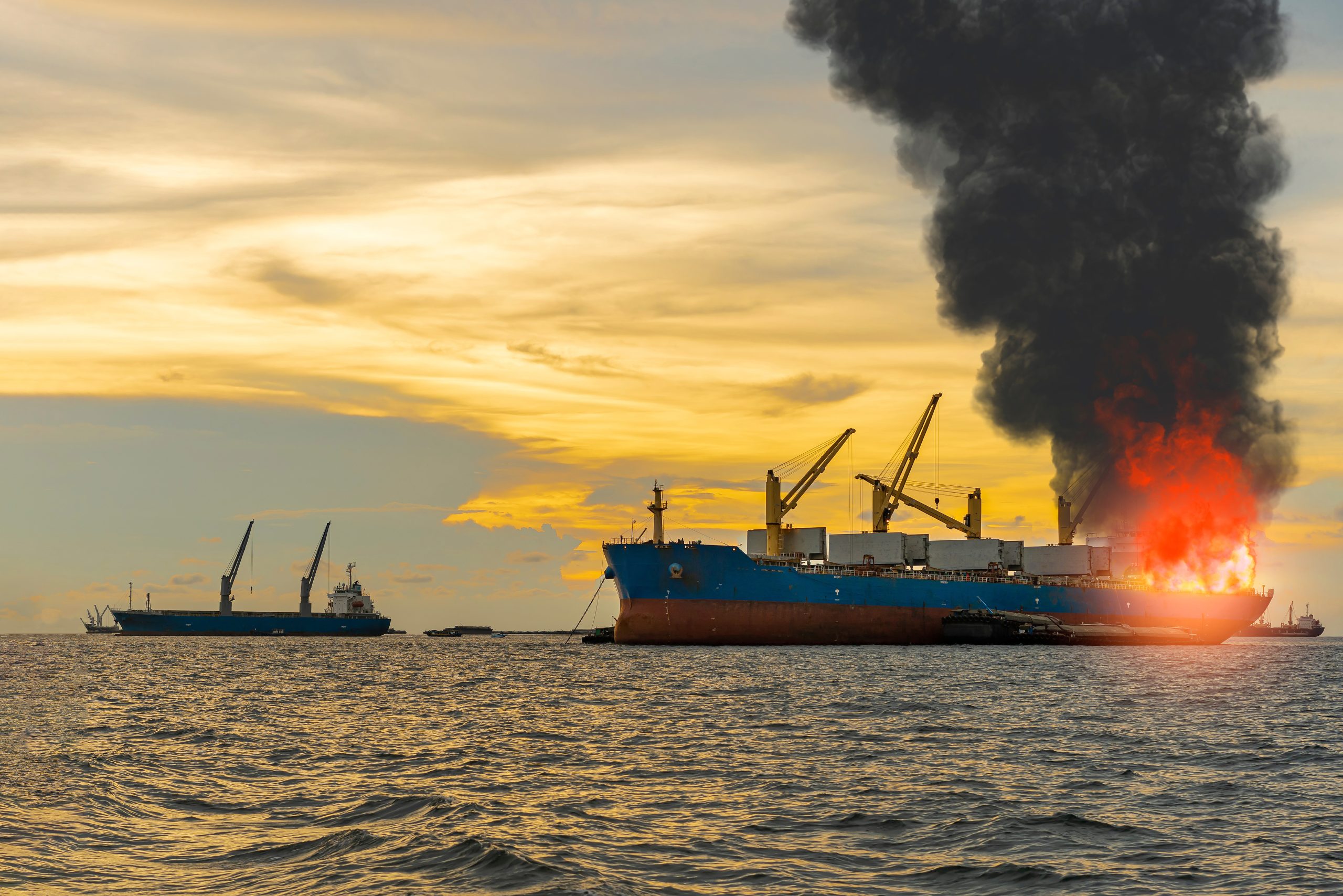 AI-genererad bild av batteriexplosion ombord på ett fartyg.
