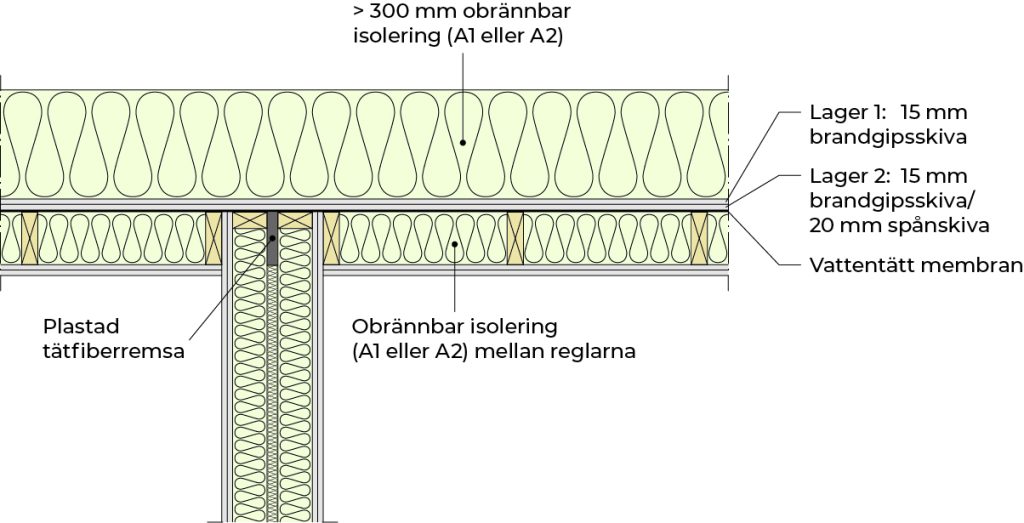Några utvalda fokusområden i branschreglerna är vindar, dolda utrymmen och genomföringar. I dessa konstruktioner är det särskilt viktigt med robusta lösningar för att motverka brandspridning och begränsa skador orsakade av brand. Vid vissa förhållanden finns risk för att vindsbränder sprids nedåt i byggnaden i spalter, samtidigt som släckvatten över tid riskerar att tränga ner i underliggande konstruktion. För att ge ett bättre skydd mot skador ska bjälklaget begränsa spridning av både brand och släckvatten (se figur 1).