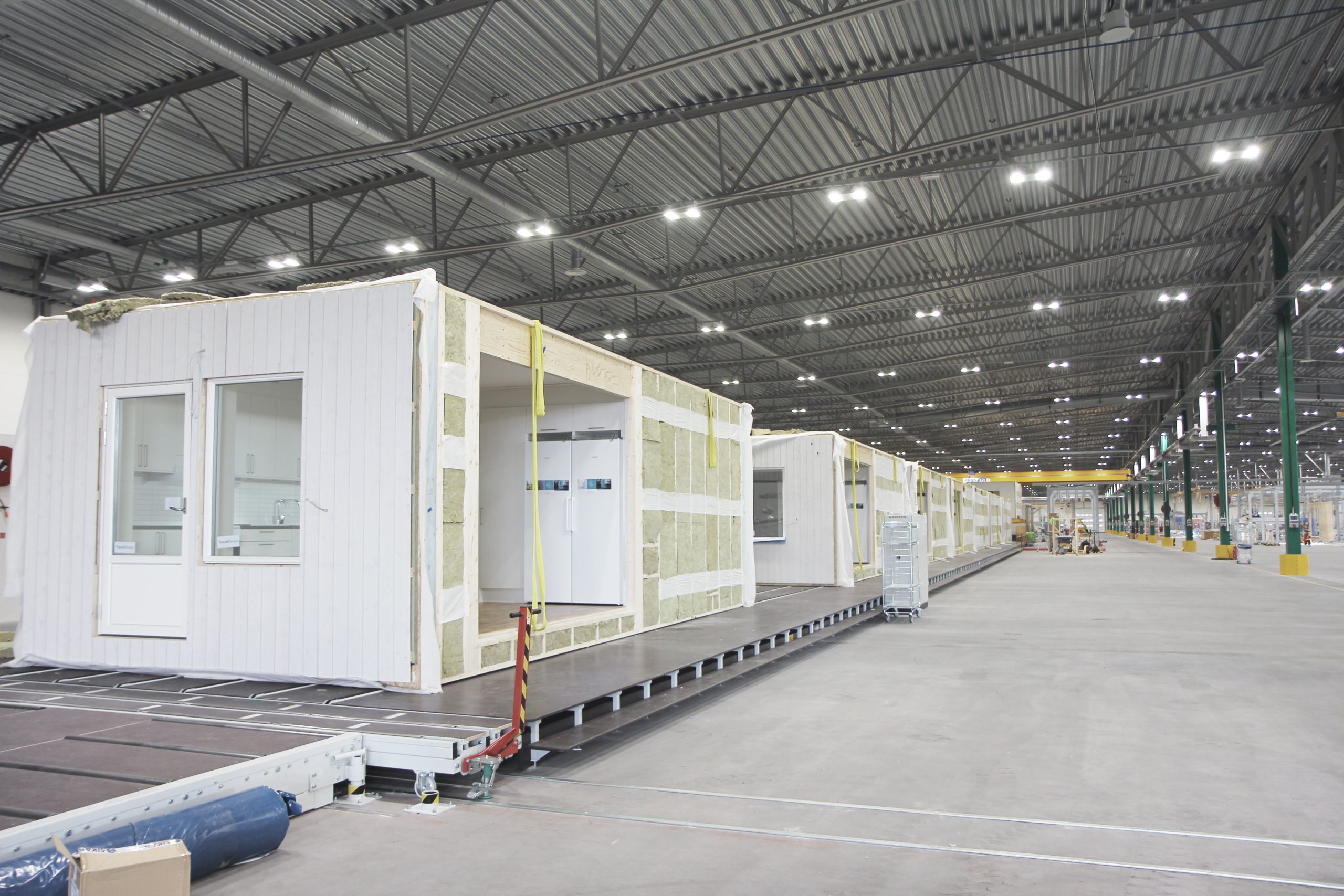 Byggnad bestående av prefabricerade tredimensionella moduler, även kallade volymer, som sätts samman av planelement i en fabrik. Modulerna byggs upp av väggar, golv- och takbjälklag. Förutom själva stommen monteras även beklädnader, installationer och inredning, till exempel köksskåp. Efter att modulerna färdigställts förses de med väderskydd innan de transporteras till byggplats där de monteras till färdig byggnad.